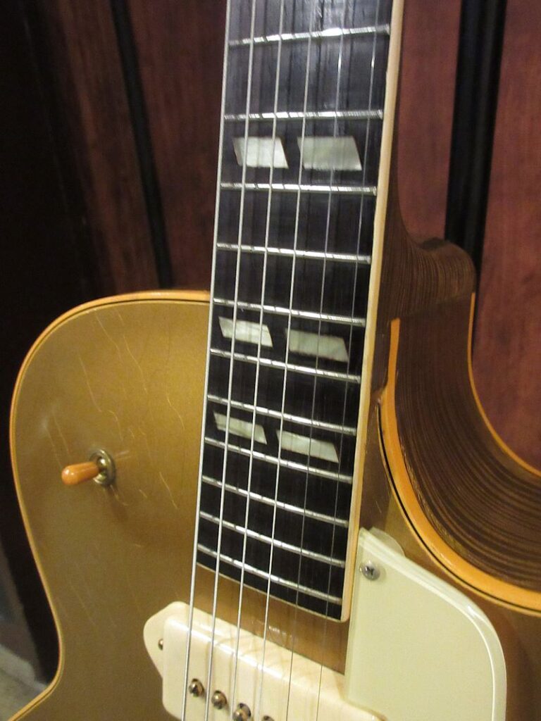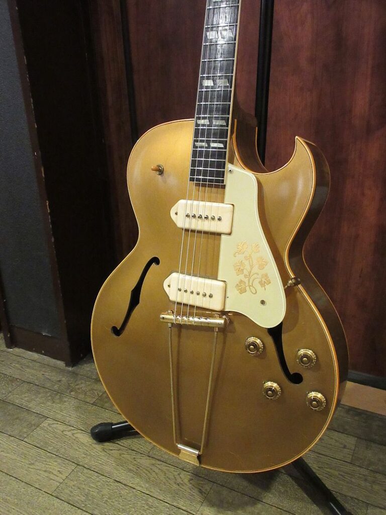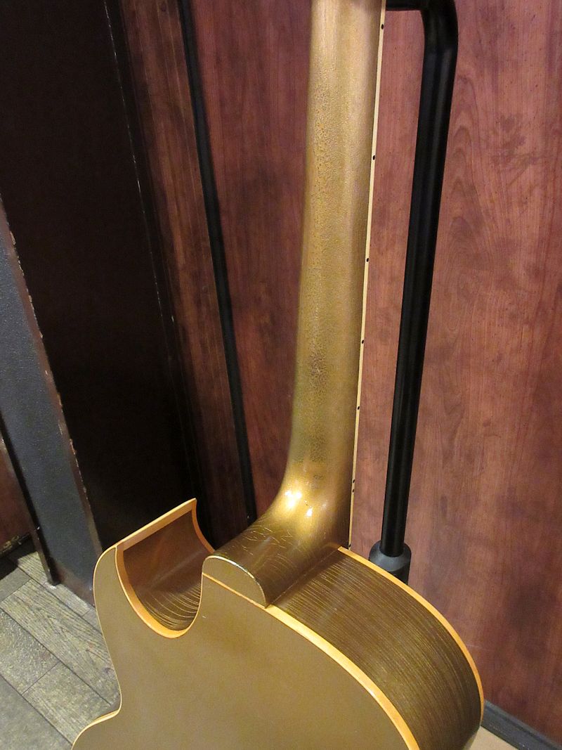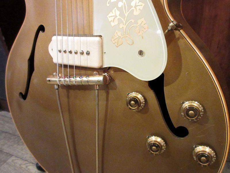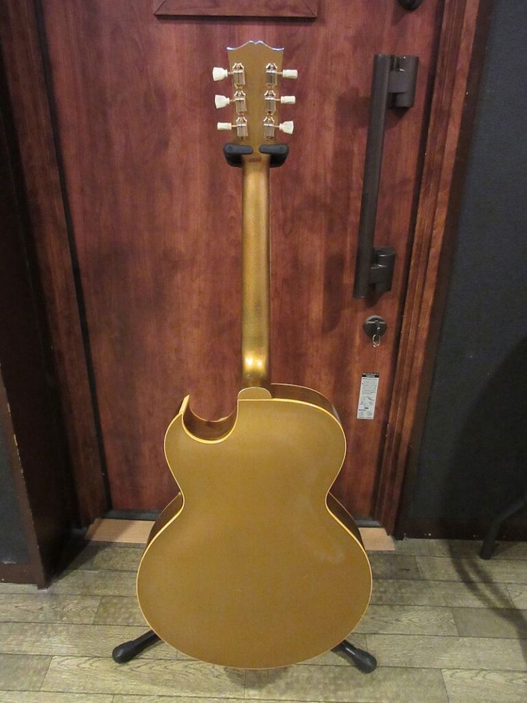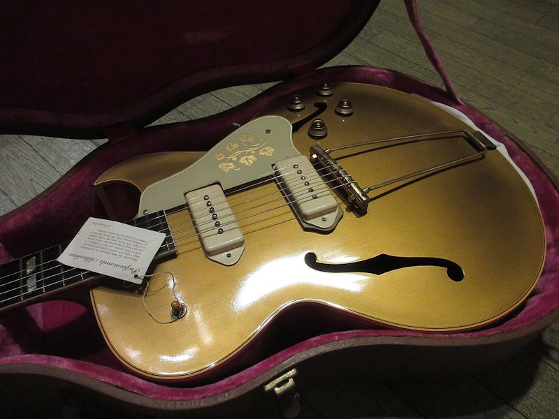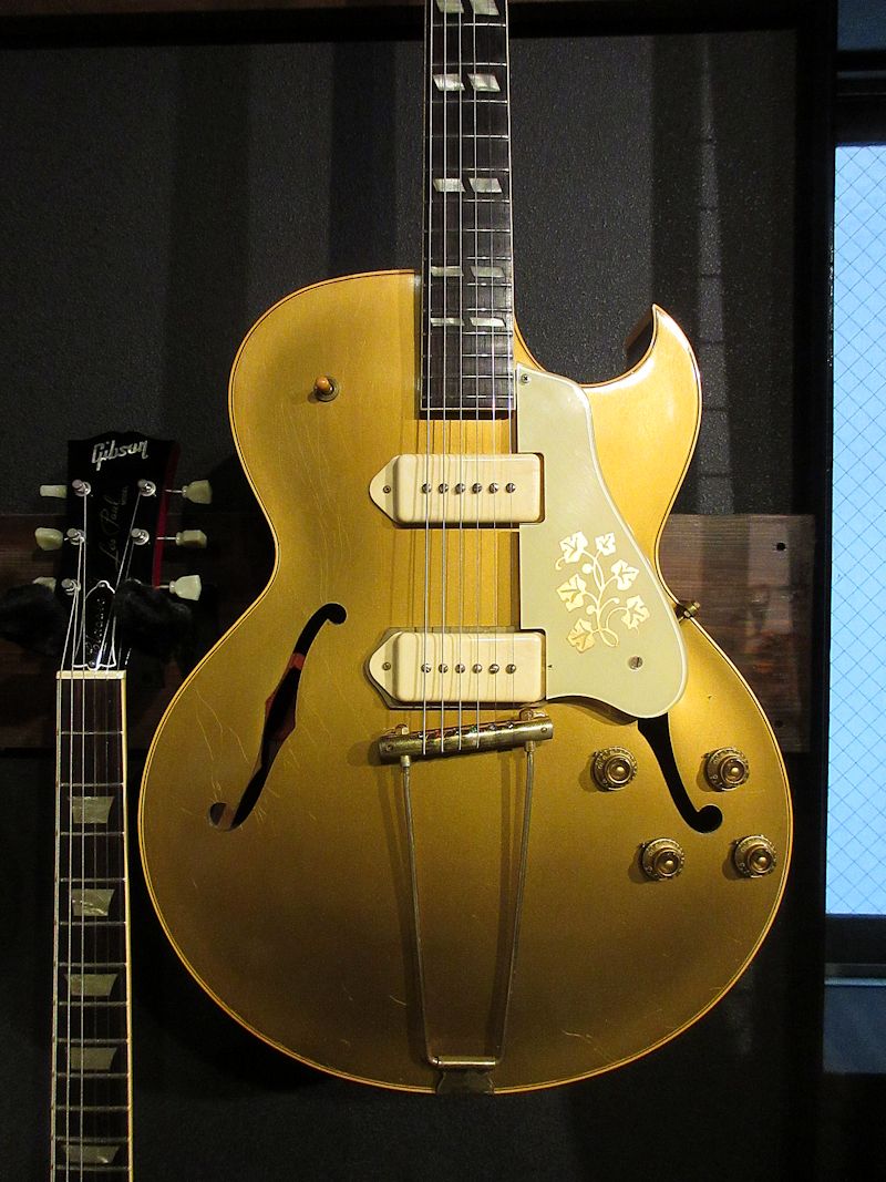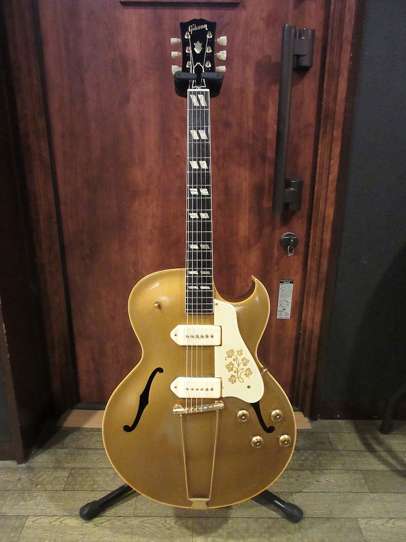 1952年から1958頃まで短期間のみ生産されていたES-295はES-175をベースとして開発され、16インチ幅のフルアコ―スティックボディーにP-90ピックアップを2基搭載。オールゴールドフィニッシュ&ゴールドハードウェア、加えてダブルパラレログラムポジションマーク、フラワーパターンのピックガードがあしらわれた、50年代アメリカのカルチャーを感じるルックスが魅力のモデル。故スコッティー・ムーア氏をはじめ、Char氏や奥田民生氏も愛用していることで知られています。本機は1955年製、フルオリジナルで素晴らしいコンディションをキープした個体!それもそのはず、数十年前にアメリカで購入され、国内ワンオーナーで長らく大切に扱われてきた1本。フルアコ特有のふくよかな生鳴りに、P-90ピックアップによるファットでレンジ感豊かな絶品のサウンド♪175のウッドブリッジとはまた異なるトラピーズテイルピース独特の響きはウォームでクリスピー、リイシューモデルとは一味違うGibson黄金期の50年代フルアコサウンドが存分に楽しめます!このクラスのES-295は昨今中々お目にかかれないレアピースですので、この機会をお見逃しなきよう!こちらも素晴らしいコンディションのオリジナルブラウンハードケースが付属致します。