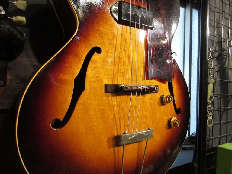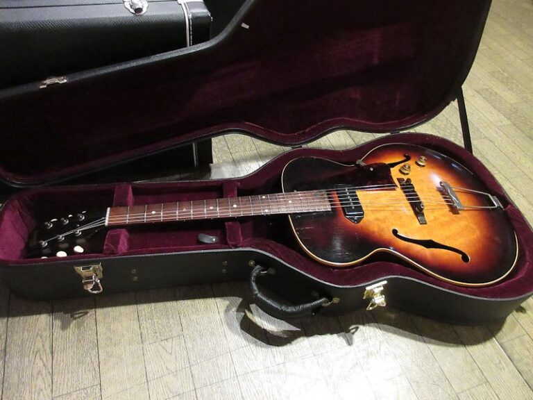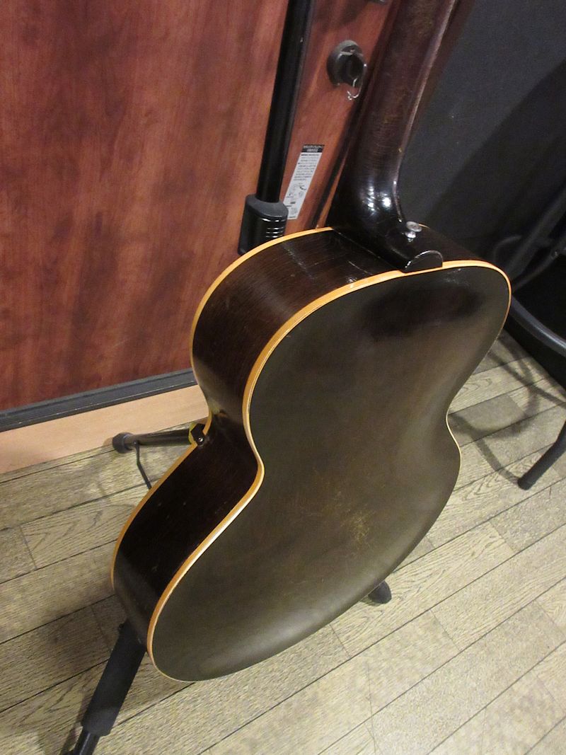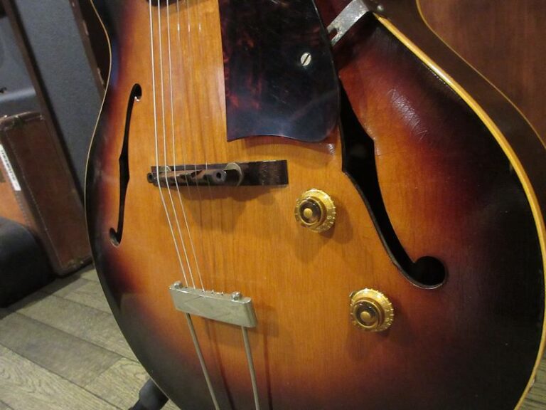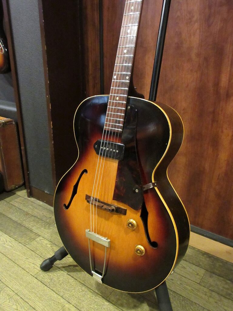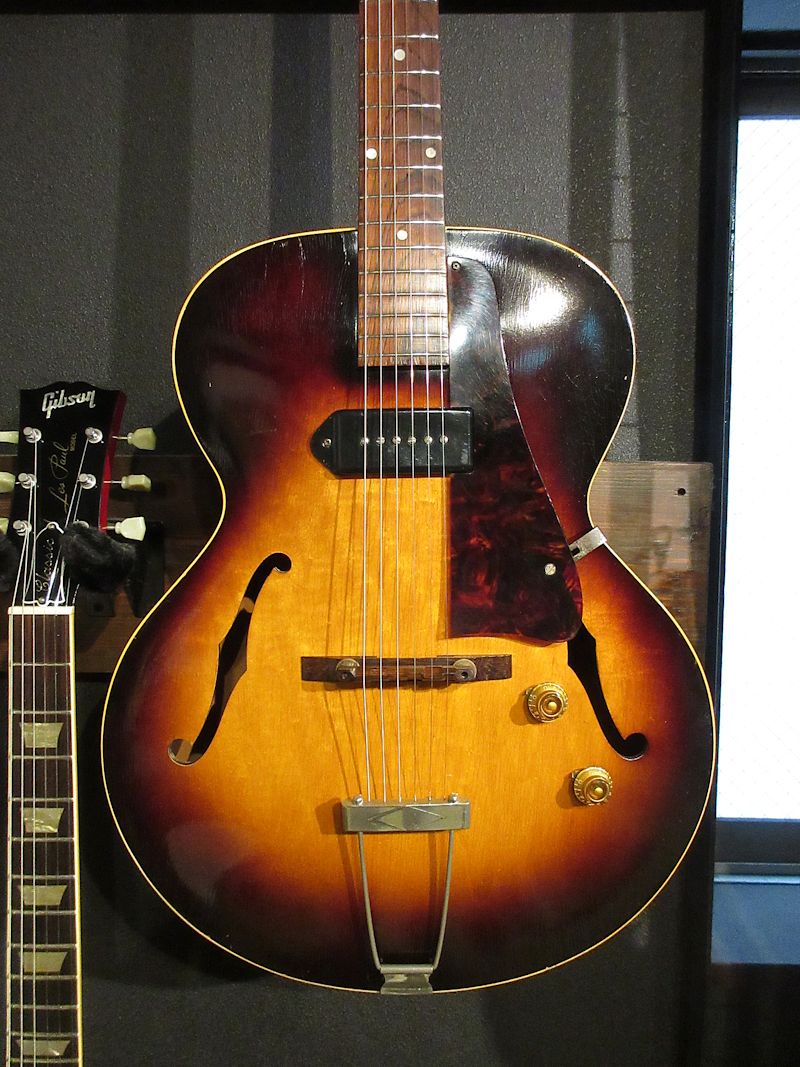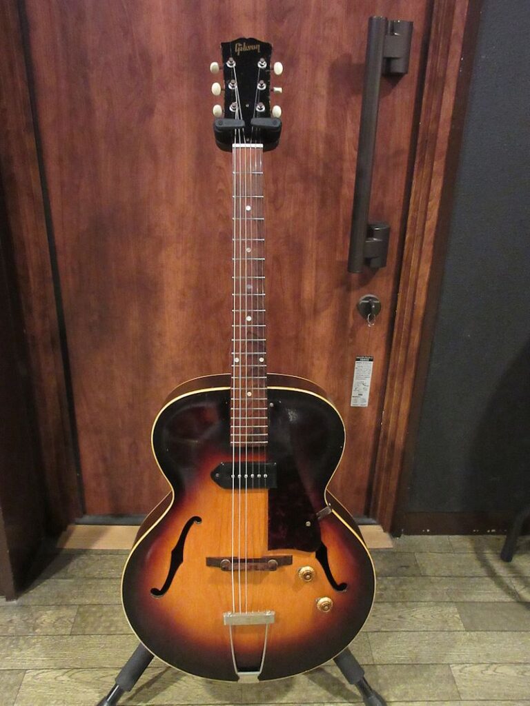 1938年から製造が続けられていたES-100の後継機種として1946年に登場したES-125。シンボディーモデルやデュアルピックアップモデルなど様々なバリエーションを誇り、上記機種に勝るとも劣らないサウンドクオリティーは根強い人気を誇り、未だファンの多いモデルでもあります。本機は1956年製の個体、サンバーストカラーの色味が美しく残り、フレイミィなメイプル材とのコントラストが美しい個体。フレット・ナット交換済でとても弾きやすく、フルデプスボディーならではの深くエアー感のある胴鳴りは「アーチトップのGibson」の矜持を感じさせてくれます。ヘッドのウイング部に補修歴はございますが、きちんと接着修理されており、セットアップもしっかり決まっております!黄金期50年代のサウンドをしっかり感じられる個体がこのプライスにて!ジャジーな甘いトーンから賑やかなジャンプブルーズまで難なくこなすヴィンテージフルアコのスタンダードとも言える名機。この機会に是非どうぞ♪汎用ハードケースが付属致します。