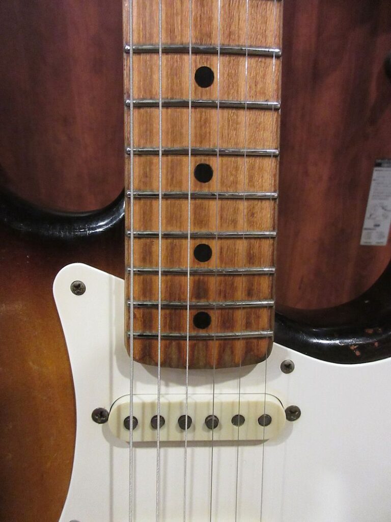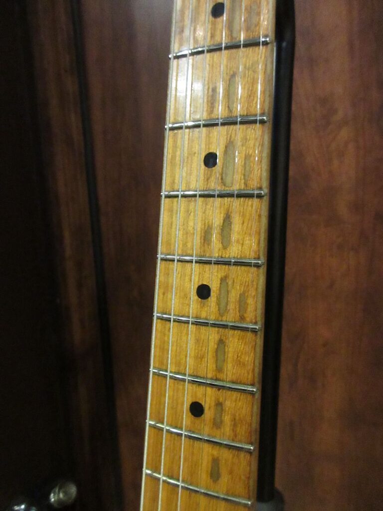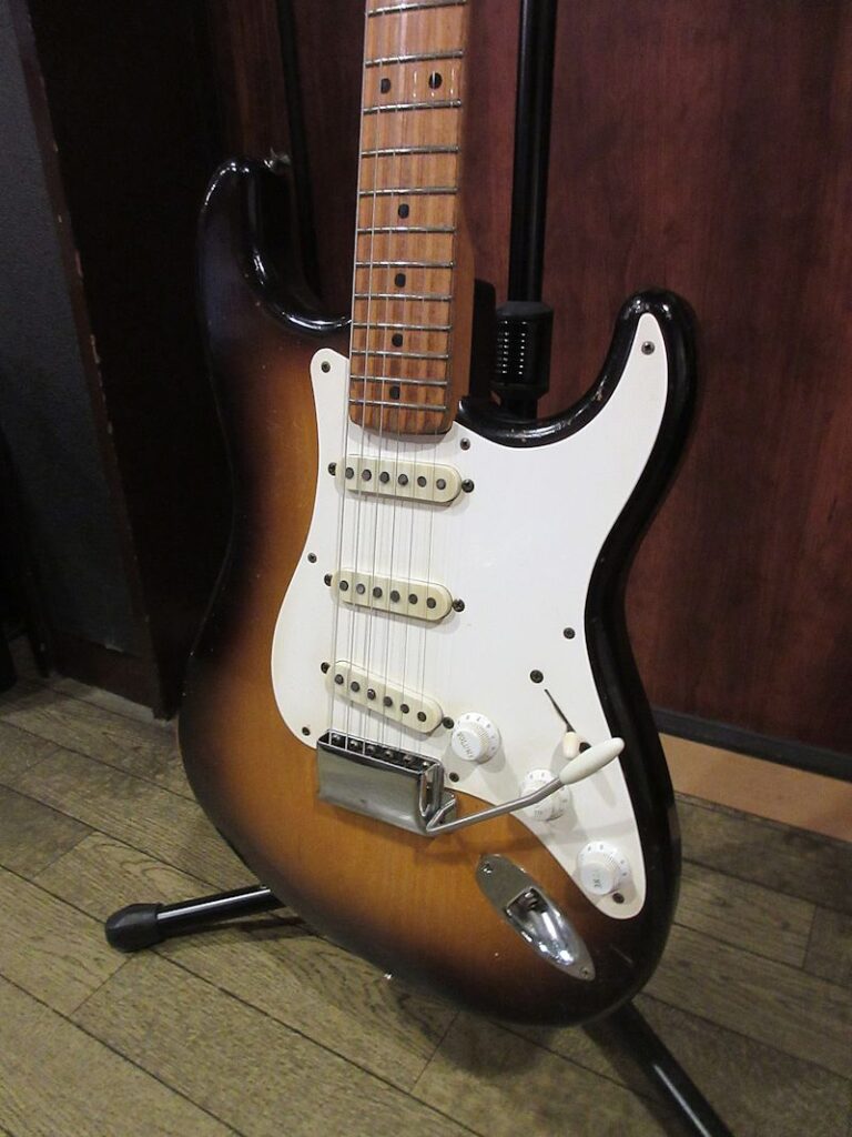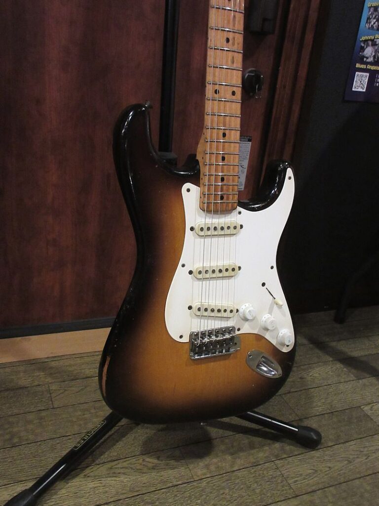 1954年に誕生したStratocaster。1956年途中にはボディー材がアッシュからアルダー材に変更となり、パーツの材質やストリングスガイドの形状変更など、マーケットやプレイヤーからのフィードバックに基づく細かな仕様の変更があり、50‘sメイプルネック期における一つの完成形を見た年式と言っても良いでしょう。この年のStratocasterはEric ClaptonがDerek & The Dominos期に使用していた通称「Brownie」と同年式にあたり、国内外における人気は今も尚、衰えることがありません。本機は薄っすらとフレイムの入ったソフトVシェイプを有し、やや退色した2トーンサンバーストが得も言われぬ貫禄を醸し出す1本。小傷こそ散見されるものの、塗装の艶も美しく残った非常にクリーンなコンディション。指板面の塗装を残したまま丁寧にリフレットされており抜群の弾き心地を誇ります。トレモロスプリング交換、その他のパーツに変更点は見当たらずオリジナリティーも非常に高い1本です。ネックデイト57年4月、ボディーデイトは57年4月、ポットデイト57年15週。この時期のブラックボビンピックアップらしい重心が低く、枯れたトーンが心地よく、倍音も豊富に出ているサウンドも出色の個体。昨今ここまでコンディションの良いメイプルネック期のストラトキャスターも流通量が非常に少なくなってきました。正に一生物と言っても過言ではない歴史に残る名機、お探しの方には是非ご一考頂きたい極上機です!ウェイト3.46kg、ブリッジカバー、バックプレート、オリジナルアーム、こちらも大変状態の良いオリジナルツィードトーレックスケースが付属致します。
