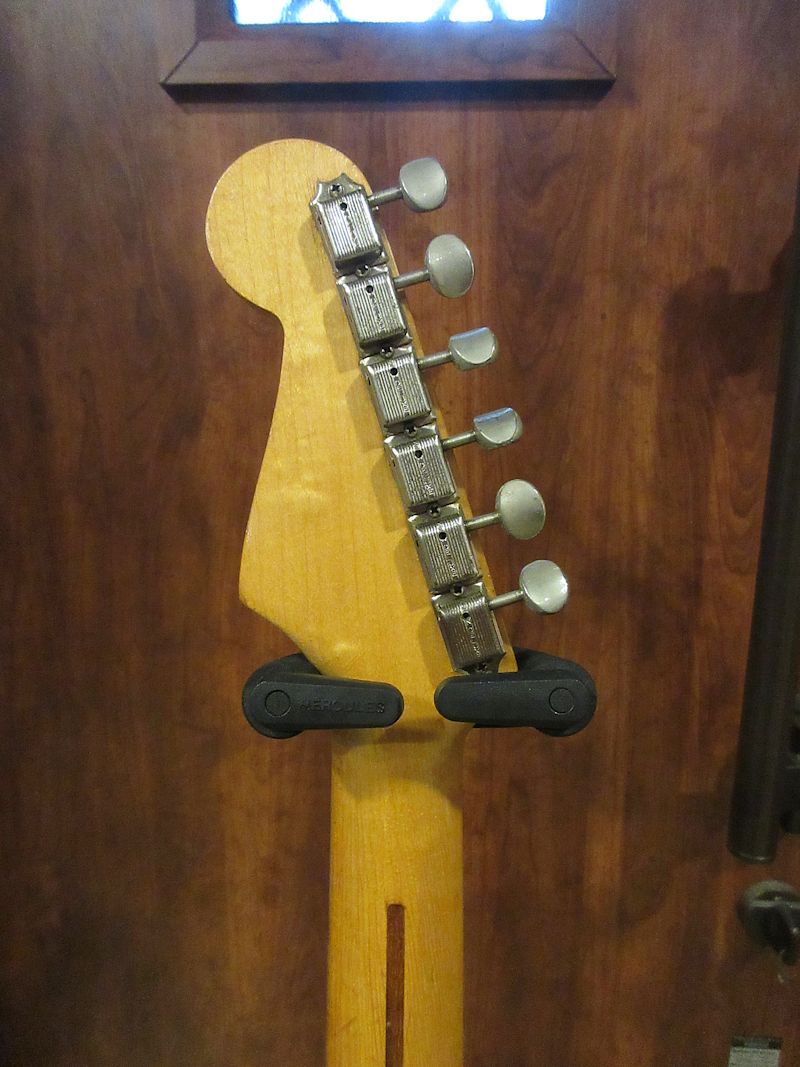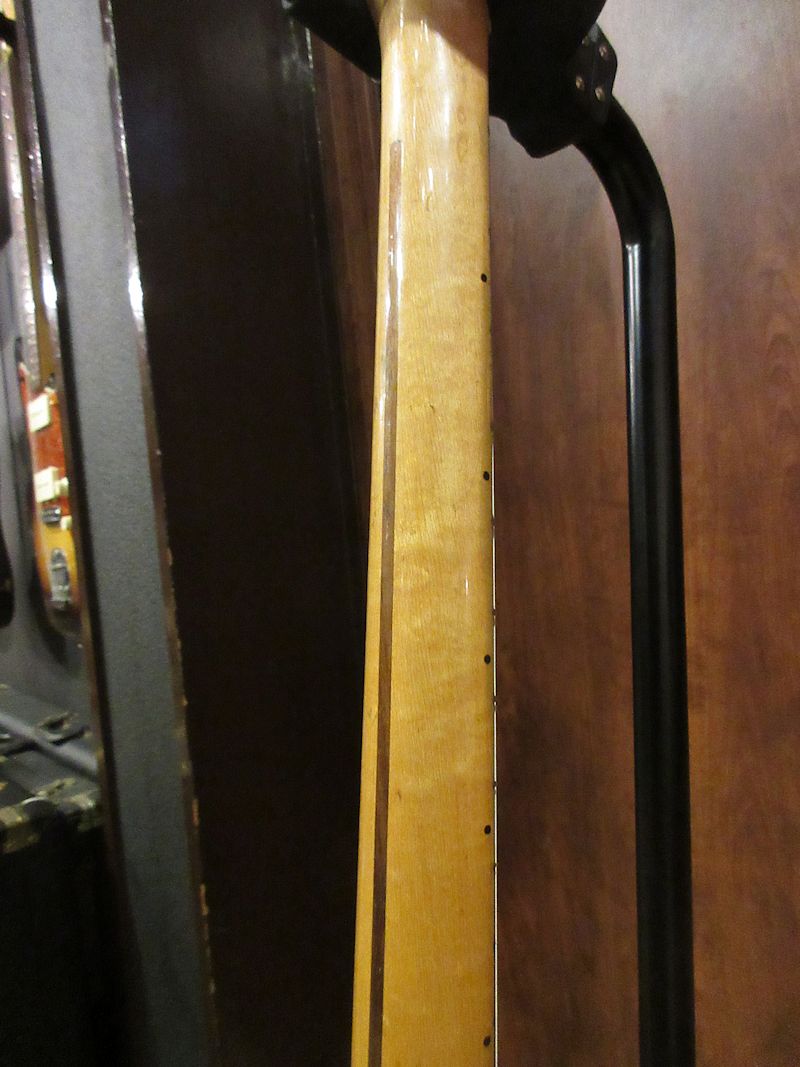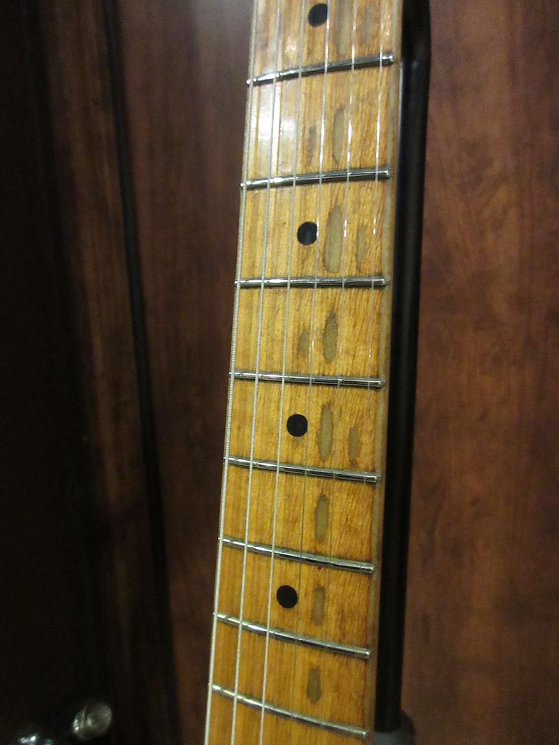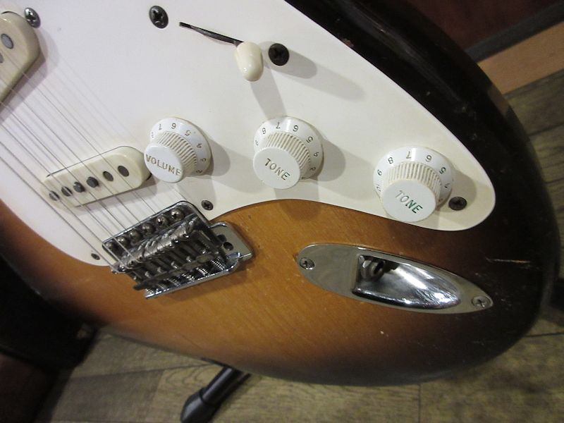1954年に誕生したStratocaster。1956年途中にはボディー材がアッシュからアルダー材に変更となり、パーツの材質やストリングスガイドの形状変更など、マーケットやプレイヤーからのフィードバックに基づく細かな仕様の変更があり、50‘sメイプルネック期における一つの完成形を見た年式と言っても良いでしょう。この年のStratocasterはEric ClaptonがDerek & The Dominos期に使用していた通称「Brownie」と同年式にあたり、国内外における人気は今も尚、衰えることがありません。本機は薄っすらとフレイムの入ったソフトVシェイプを有し、やや退色した2トーンサンバーストが得も言われぬ貫禄を醸し出す1本。小傷こそ散見されるものの、塗装の艶も美しく残った非常にクリーンなコンディション。指板面の塗装を残したまま丁寧にリフレットされており抜群の弾き心地を誇ります。トレモロスプリング交換、その他のパーツに変更点は見当たらずオリジナリティーも非常に高い1本です。ネックデイト57年4月、ボディーデイトは57年4月、ポットデイト57年15週。この時期のブラックボビンピックアップらしい重心が低く、枯れたトーンが心地よく、倍音も豊富に出ているサウンドも出色の個体。昨今ここまでコンディションの良いメイプルネック期のストラトキャスターも流通量が非常に少なくなってきました。正に一生物と言っても過言ではない歴史に残る名機、お探しの方には是非ご一考頂きたい極上機です!ウェイト3.46kg、ブリッジカバー、バックプレート、オリジナルアーム、こちらも大変状態の良いオリジナルツィードトーレックスケースが付属致します。