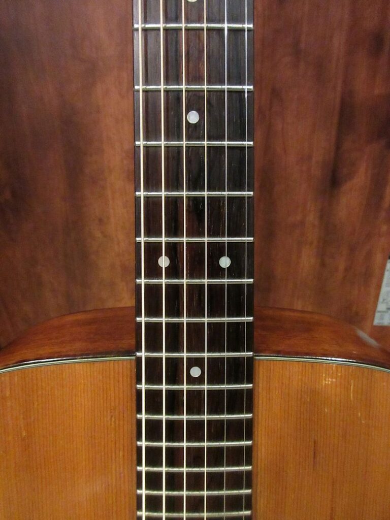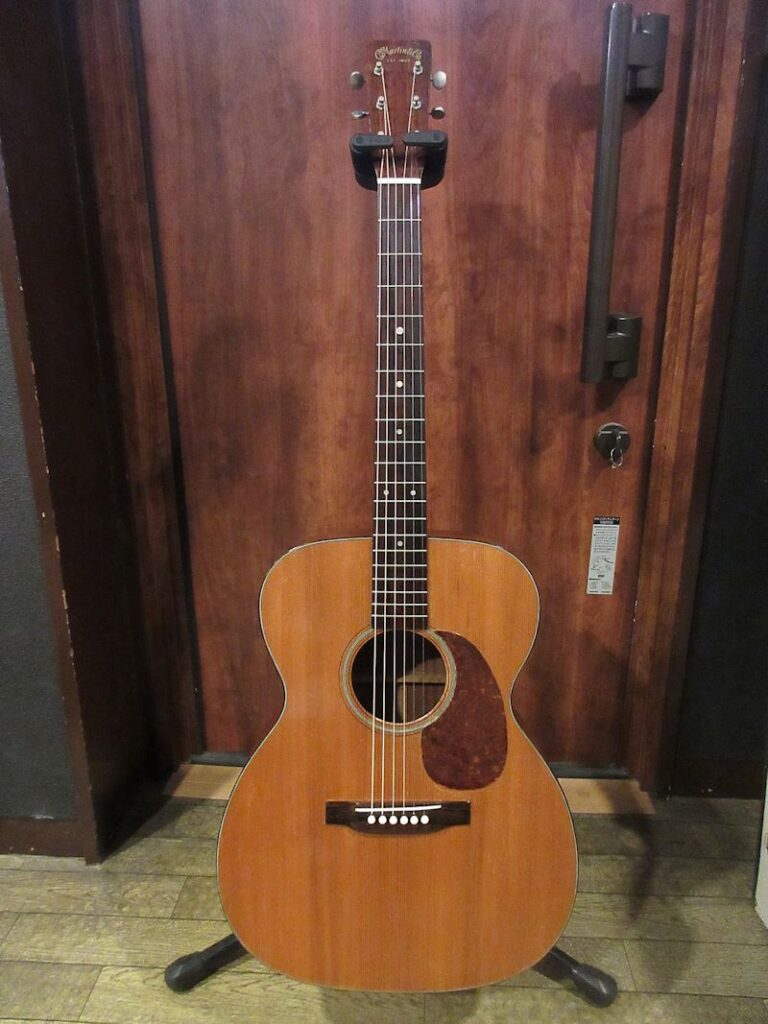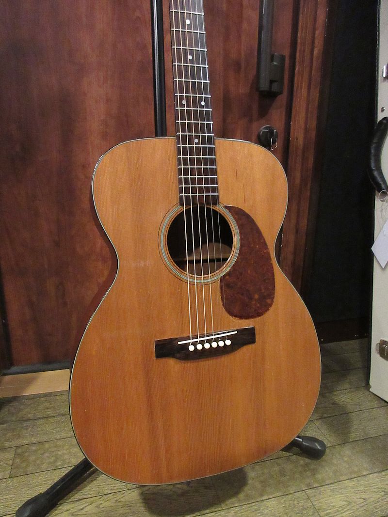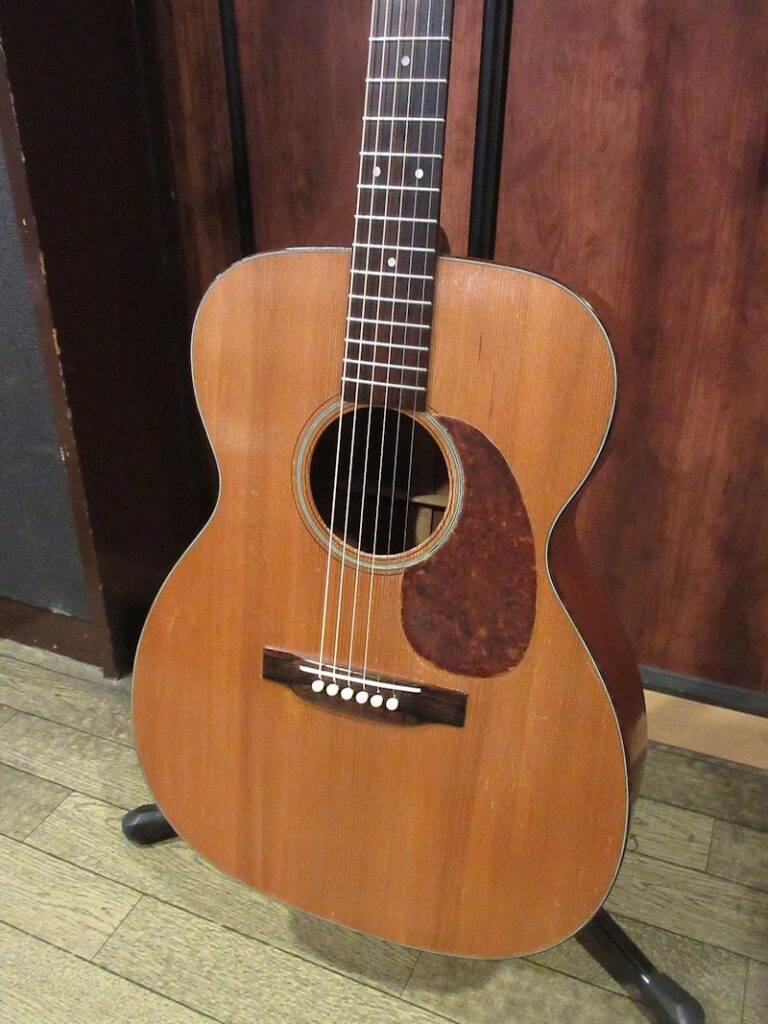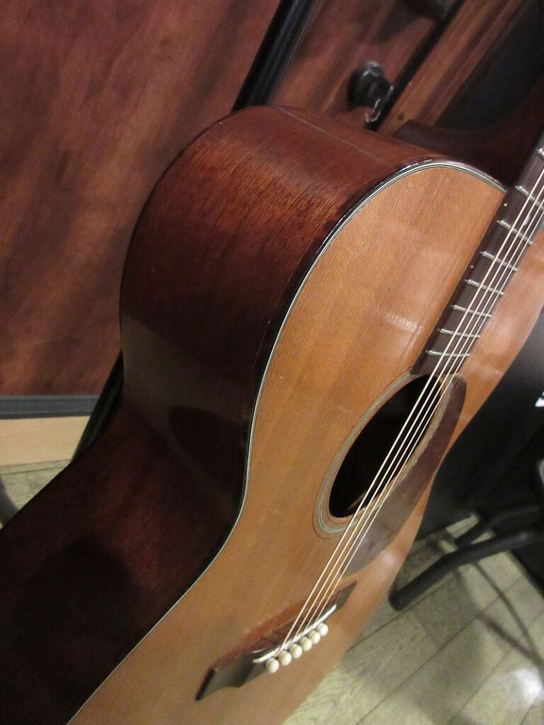 Martinギターの中でも歴史の古い000サイズは1902年に誕生し、オーケストラモデル最大のボディーサイズを持つ機種でした。抱えやすいサイズがもたらす適度な箱鳴りと、トーンバランスの良さには定評があり、ローズウッドサイドバックの28、マホガニーサイドバックの18、共に現在でも非常に人気の高いモデルです。本機は1957年製の000-18、この時期特有のトーティス柄ピックガードが特徴的な1本。マホガニーボディーのヴィンテージマーティンならではの軽量ボディー、インストゥルメンタルや歌もののバッキングなどにジャストフィットするバランスの良い鳴り感が心地よく、素朴で温かみのあるトーンは当時の良質な木材の恩恵をしっかりと感じさせてくれます。過去に全体が極薄くオーバーラッカーされ、古い時期にブリッジ両端がネジ止めされていた痕跡やエンドピンの折れなどは見受けられますが、それだけ歴代オーナーに弾きこまれ、長きにわたり愛されてきた証とも言えるでしょう。フレット・ナットは交換され弦高も適正、演奏性もしっかり決まっております。40年代はもとより50年代の000もいよいよ出物が少なくなってきた昨今、このあたりの年式でお探しの方は是非チェックしてみてください♪ハードケース付属。