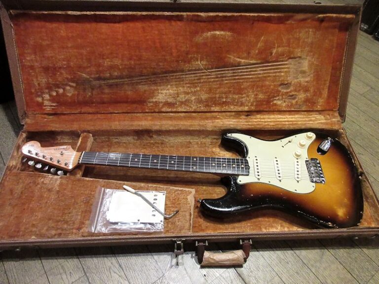 前年1959年からそれまでのメイプルワンピースネックからローズウッド指板にモデルチェンジしたStratocaster。1962年途中までのスラブ貼りのローズウッド指板を持つ個体は、充実したローミッドのトーンを有し、長いStratocasterの中でも1、2を争う人気を誇ります。今回入荷の1本は1960年製、この時期特有の所謂チョコレートサンバーストカラーに経年感が相まって抜群のルックスに仕上がった個体!一時期アッセンブリごと別のものに載せ替えられていた時期があったようで、追加のビス穴と(現在は綺麗に埋められております)、導電塗料のリムーブされた痕跡が見られますが、現在はオリジナルのアッセンブリに戻されております。POT Dateは59年46週目、ボディーデイトは60年2月。スラブ貼りの指板にオリジナルブラックボビンの組み合わせはやはり強烈!長年弾き込まれたことによる反応の速さ、絡みつく色気のある倍音感。この時期のストラトがTop of Topと評価するプレイヤーが多いことも納得のサウンドです!フレット・ナットもオリジナルをキープしており、トータルコンディション良好な個体です♪前述のイシューがある為、相場よりお買い得感のあるプライスとなっておりますので、この機会に是非ゲットなさってください!ウェイトは軽量な3.29kg、オリジナルブラウンドトーレックスケース付属。