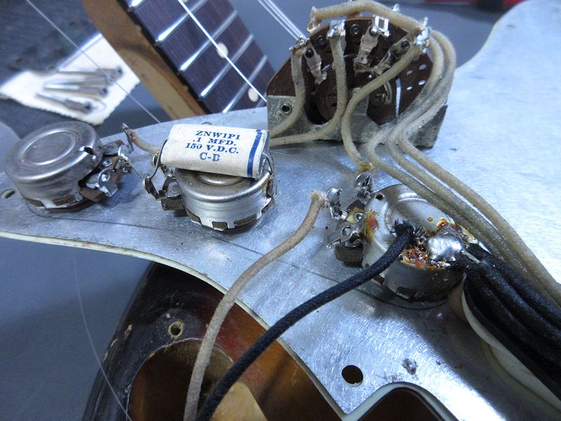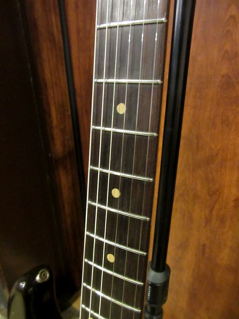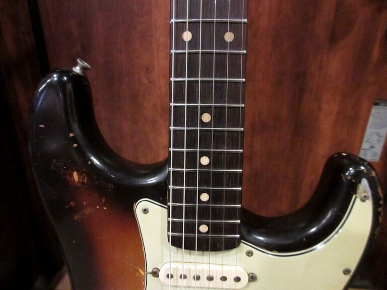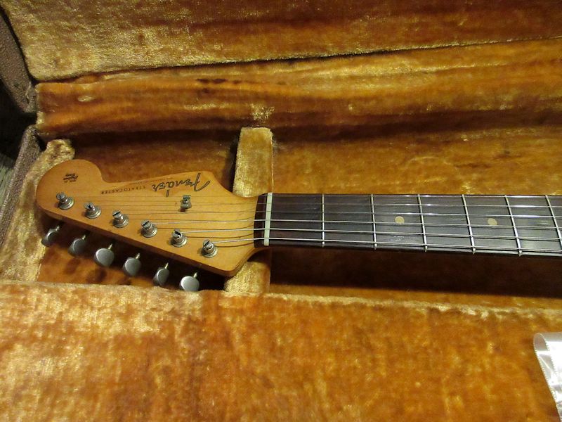 1954年の誕生以来、メイプルワンピースネック仕様で生産が続けられたStratocasterですが、1959年半ばに他のモデルと足並みを揃える形でスラブ貼りのローズウッド指板へと仕様変更されました。「スラブ期」のストラトキャスターが持つ充実したローミッドのサウンドは長いStratocasterの歴史の中でも1,2を争う人気を誇り、未だ求める方が多い仕様。62年途中にはラウンド貼りのローズウッド指板へと変更されるため、実質3年ほどしか生産されなかった貴重なモデルです。今回入荷の1本は1960年製、スラブ貼りのブラジリアンローズウッド指板を持ち、しかも1963年前後のStratocasterに存在する「Big Neck」と呼ばれるファットなネックグリップに近いグリップシェイプを持った個体!豊富な倍音成分と乾いたハリのあるトーンが同居した存在感抜群のサウンドはグレイトとしか言いようがなく、1959年から1960年にかけての個体特有の2トーンサンバーストもポイントです。ホーン部のストラップピンとアウトプットジャックが交換されており、グリーンガードの一部には僅かなチッピングやヒビこそ見られるものの、トータルコンディションの良い個体。年々流通量の減少しているスラブ期のStratocaster、要チェックの一本です♪とても軽量3.23kg、少々くたびれておりますが、オリジナルブラウントーレックスケースが付属致します。