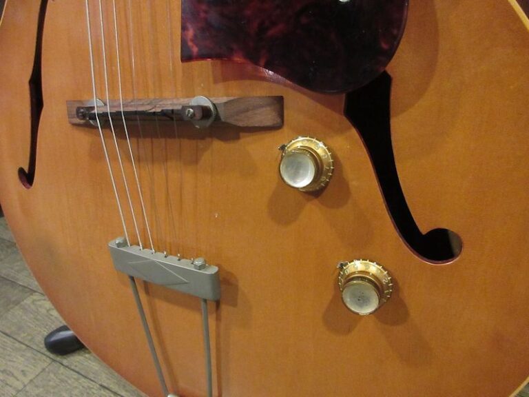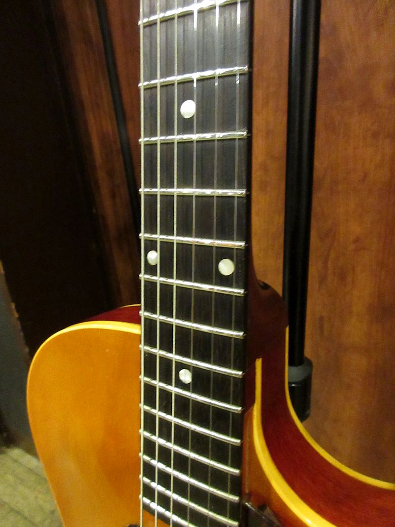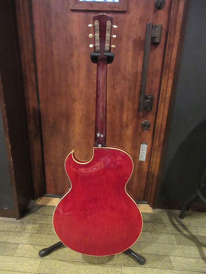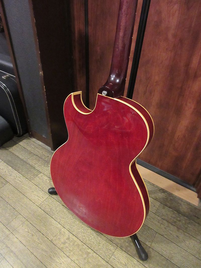 前身にあたるES-100の後継機種として1946年に発売されたES-125。デュアルピックアップやカッタウェイモデルなど多くのバリエーションモデルが存在し、比較的安価であったことから、取り回しに優れたフルホローボディーを積極的に市場に投入することで更なるシェア拡大を企図していたことが伺えます。本機は1963年製、カッタウェイボディーにP-90ピックアップを一基搭載したモデル。POT、ジャック(オリジナルPOT・ジャック付属)ピックガードマウントビスの交換など、いくつかのパーツチェンジはあるもの、フレット・ナット交換済でプレイアビリティー良好な1本。赤みが退色したカラーが雰囲気たっぷり、抱えやすく軽量なThinボディーシェイプも高ポイント。ウッドマテリアルの素晴らしさ、作り込みの良さをたっぷりと味わえるサウンドクオリティーでありながら、肩肘張らずにリラックスしてプレイできるコストパフォーマンスに優れたヴィンテージギター。リビングでもセッションでもライブでも、黄金期のGibsonをたっぷり楽しめる1本をこの機会に是非どうぞ。TKL製ハードケース付属。