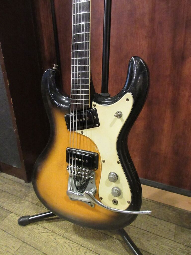 リッケンバッカー社を経て、のちにFenderに在籍するロジャー・ロスマイルズなど、著名な楽器製作者やエンジニアから直接ギター製作について学んだセミー・モズレーが1956年にカリフォルニアで立ち上げたギターブランド「Mosrite」。1962年にカントリーギタリストのジョー・メイフィスの為に製作したモデルをベースとして開発されたのが「The Ventures Model」です。1963年から1965年にかけて様々なスペックのモデルが存在しますが、本機はとりわけ高い評価を受けているVibramuteトレモロ搭載期のモデル。POT DATEが65年03週目ながらスモールポールピースでボディとネックのジョイントはプレートでカバーされている’64年仕様で1965年初頭に出荷された1本です。ウッドマテリアルはブラジリアンローズウッド指板のメイプルネックにバスウッドボディーの組み合わせ。高出力なピックアップがもたらす倍音成分をしっかり含んだ芯の太いサウンド、絶妙なレンジ感は、歪みとの相性も素晴らしく、ラモーンズのジョーイ・ラモーンの愛機であったこともうなずける、ノイジシャンも納得の素晴らしいサウンドです。ジャズマスターやジャガーなどのプレイヤーはもちろんのこと、先入観なしで未体験のプレイヤーにも本機で試していただきたい名機!このモデルとしては比較的軽量な3.79kg、オリジナルトーレックスケース付属。