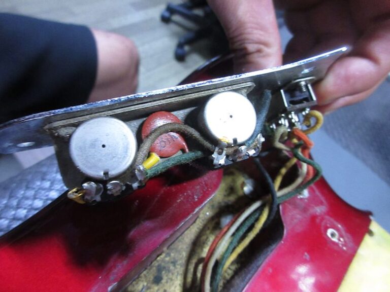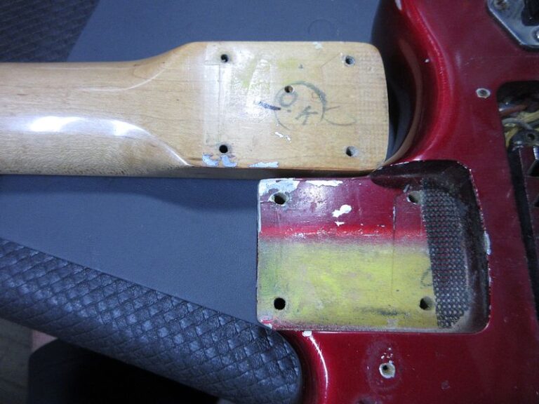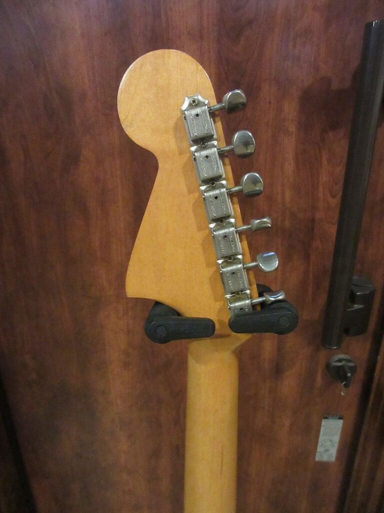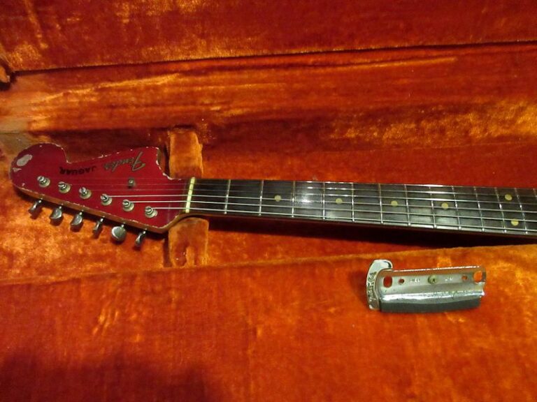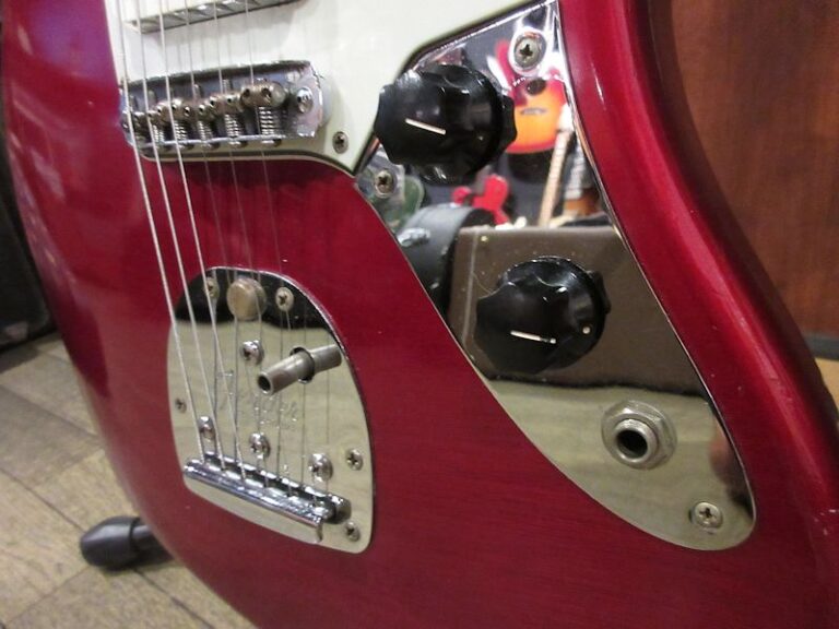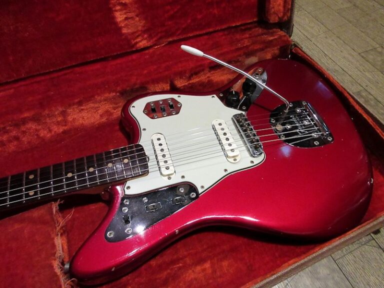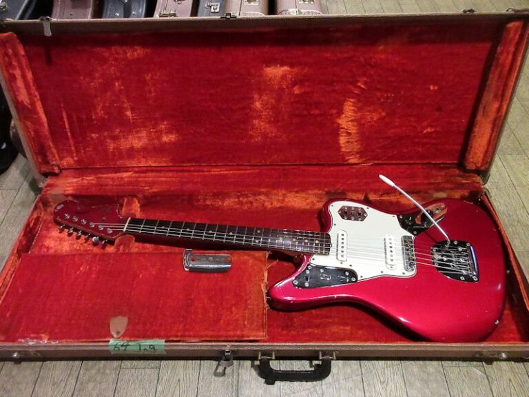 1962年に誕生したJaguar。当時のミュージックシーンを意識し、多彩な音作りを可能にしたフロントのプリセットトーンコントロールやスライドスイッチの採用など、レオ・フェンダーが当時の最高級機種に相応しい機能を盛り込んだ意欲作でした。その後もグランジやシューゲイザーのミュージシャンに愛されるモデルとして現在も根強い人気を誇っています。本機は1964年製、カスタムカラーであるキャンディーアップルレッド、マッチングヘッド仕様の1本!しかも非常に珍しいAネックの個体です。フロントにブラックボビン、リアにはグレイボビンピックアップを搭載しており、リアピックアップのみリワインドが施されております。それ以外はパーツ交換もなく、フレット・ナットに至るまでオリジナルコンディションをキープ。シルバーのアンダーコートが覗くキャンディアップルレッドカラーは発色が良く、塗装の状態も非常に美しい個体!肉付きの良いAネックシェイプで、指板には勿論良質なブラジリアンローズウッドが使われております。粒立ちの良いシングルトーン、分離感が心地よいコードサウンドは秀逸で、定評のある歪みとの相性もやはり抜群!希少スペック&ナイスサウンドのJaguar、中々出ないスペックの個体ですので是非お見逃しなく!オリジナルブラウントーレックスケース付属。