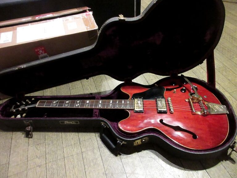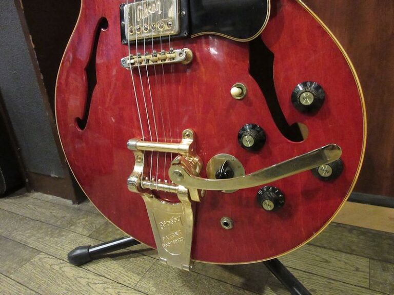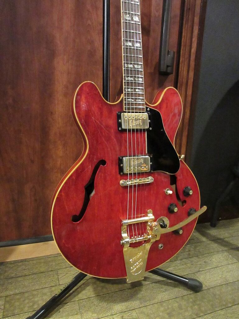 ES-335の上位機種として誕生したES-345モデル。より多彩なサウンドバリエーションを生み出せるようヴァリトーンスイッチを内蔵し、ゴールドパーツの採用、装飾面の豪華さなど上位機種ならではの仕様を備えていました。本機は人気の高いマホガニーネック期、1972年製の個体です!ヴァリトーンスイッチは取り外され、ステレオアウトからモノラルアウトに変更、それに伴うPOT交換など345のルックス面はそのままに335と同様のワイヤリングにチェンジ。オリジナルはブランコテイルピースですが、ゴールドのBigsbyが後付けでマウントされ、スーパークールな外観に仕上げられております♪ピックアップは「Gibson」エンボスロゴ入りのオリジナルピックアップを2基マウントし、フレット・ナットは交換済み。また、ポインターワッシャーは外されております。ナット裏にごく浅いクラックがありますが(工房にて接着修理済み)演奏に支障はなく、乾いたボディー鳴りに、Bigsbyらしい艶やかなトーンが合いまった素晴らしいヴィンテージサウンドを持った個体です。プレイヤーの方に是非是非お勧めしたいマホガニーネック期のナイスな個体、やや退色したチェリーレッドも雰囲気アリアリの1本です!70年代後半のGibsonオリジナルハードケースが付属致します。