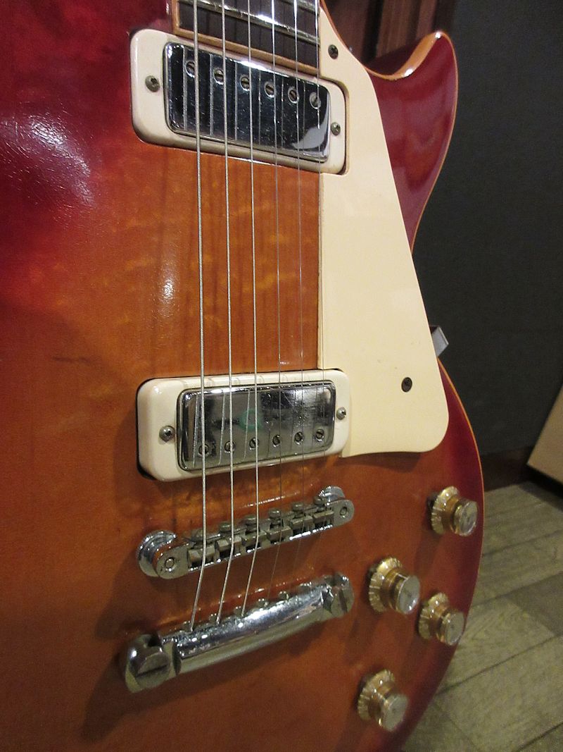 1969年に登場したLes Paul Deluxe。復活したオリジナルシェイプのレスポールモデルとしては記録的なセールスを誇る人気機種として1980年代初頭まで生産が続けられました。近年ではフェンダーをメインで使用されている方からも、クリアで輪郭のはっきりしたトーンが支持されているこちらのモデル。本機は1975年製、マホガニーネック最終期の個体!コントロールノブが交換されている以外はアッセン類を含め、オリジナルコンディションをキープしており、ウェイトも4.37kgとこの時期としては軽量な1本。ウッディーかつウォームでありながら、ミニハムバッカーらしいシャープさを兼ね備えたナイスサウンドの個体です!プレーントップの個体が多いDeluxeですが、本機は3ピーストップのセンター部分には見事なフレイムが確認できるのも高ポイント♪弾いてよし、眺めてよしのマホガニーネックのデラックス、狙い目の1本をこの機会に是非どうぞ!パープルインナーのオリジナルハードケースが付属いたします。