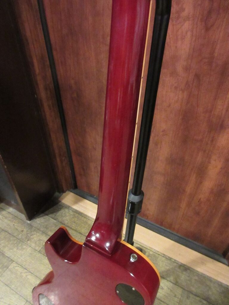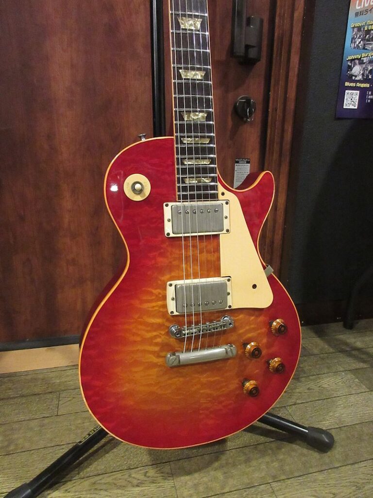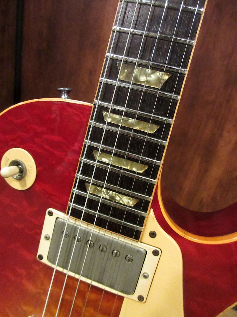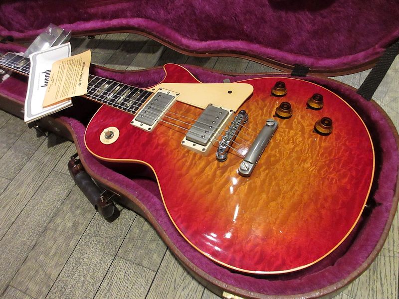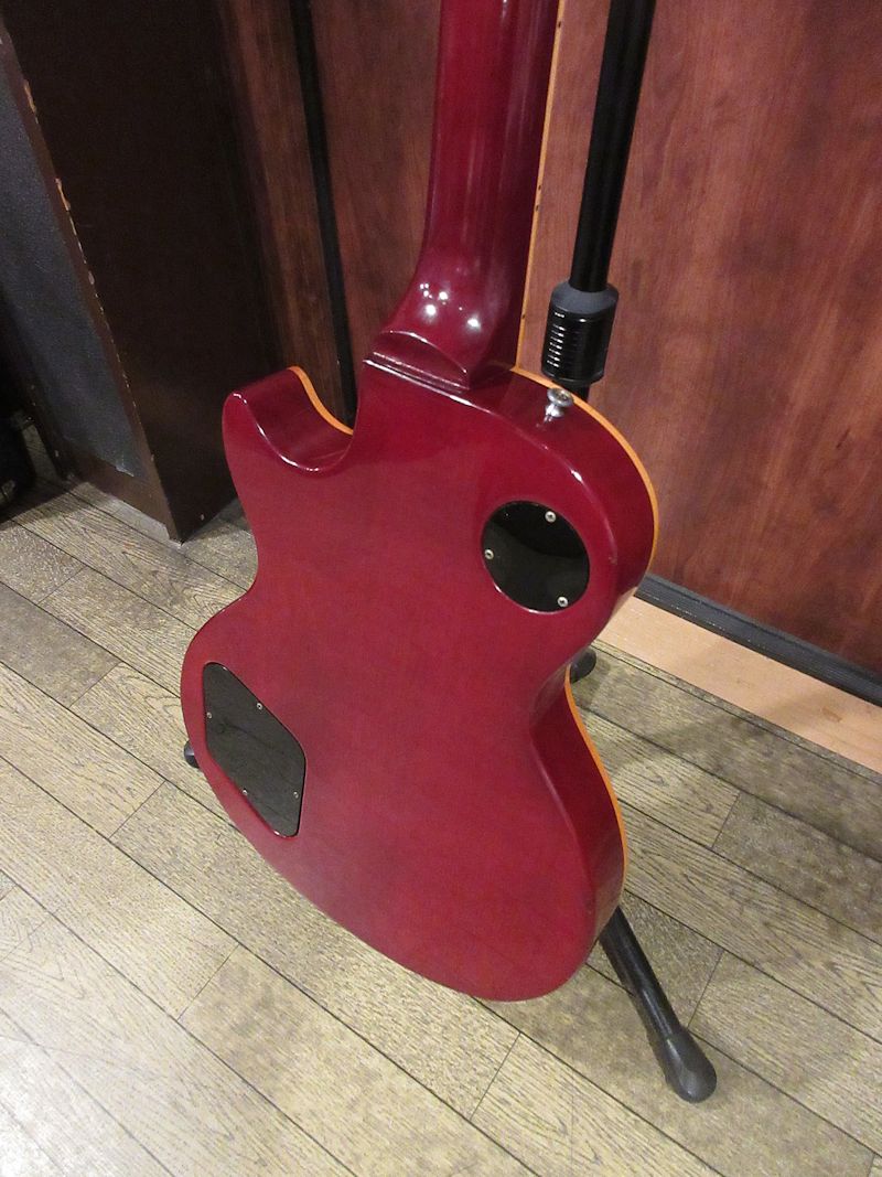 1950年代後半に誕生したオリジナルサンバーストレスポールをはじめ、数多の名機を生み出したGibsonカラマズーファクトリー。1970年代半ばに新設されたナッシュビルファクトリーへの生産拠点完全移転に伴い1980年代初頭に惜しまれつつ閉鎖されましたが、このモデルは企画、デザイン、製造など全てのプロセスがカラマズーファクトリーにおいて完結した最後のレスポールモデルと言われています。製造本数はトータル約100本など諸説ありますが、市場に非常に流通する個体が極端に少なく現存数が少ない非常にレアなモデルです。殆どの個体はトップがナチュラルカラーで、トップはキルトメイプルのような杢目ですが、一部バールメイプルのようなグレインの個体も存在します。本機はその中でも非常に珍しいチェリーサンバーストカラーの個体!何とワンオーナー品で、オリジナルオーナーに40年以上弾き込まれてきた1本です。美しい杢目とマッチしたカラーリングが非常に素晴らしく、電装系、プラスティックパーツ類も変更点はなく、大切に扱われてきたことが伺える1本。サウンドもクリスピーで、乾いた響きが非常に心地よい上質なレスポールサウンド。貴重なカラマズーファクトリー最終期のレアピース!中々流通しない個体ですのでお早目に!ウェイト4.45kg、ペーパーワーク類、オリジナルブラウンケースが付属。