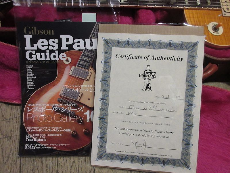 レギュラーラインのレスポールモデルの上位機種として1991年に誕生した「Les Paul Classic」モデル。1991年から1997年頃まで生産されていたモデルですが、プレイアビリティーの高いスリムテーパーグリップや、出力の高い 496R / 500Tの組み合わせは今も尚評価が高く、その後も再生産されている人気のモデル。本機は生産初年度にあたる1991年製の個体!モチロン初期生産品にだけ見られる「Les Paul Model」ロゴ表記の1本です。Trans Amber Finishはトップを覆う細やかなフレイムとの相性抜群、杢目をより際立たせる美しいカラーリングです。チューナーが近年のKluson製に、キャパシターがVintageのCornell Dublier製に、テイルピースがアルミ製の物へと交換されていますが、フィニッシュを含め全体的なコンディションは非常に良好です!オリジナルのゼブラボビン496Rと500Tピックアップは歪ませてもしっかり芯の残るサウンドで、約30年以上を経た木の鳴りをしっかりと感じさせてくれます!本機は書籍「Gibson Les Paul Guide」に掲載された個体で、過去にLAの有名ギターショップ「Norman’s Rare Guitars」で販売された際に発行されてサーティフィケートも付属致します。ウェイト3.96kg、オリジナルブラウンハードケース付属。