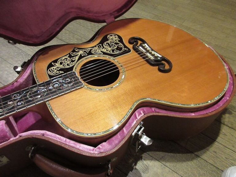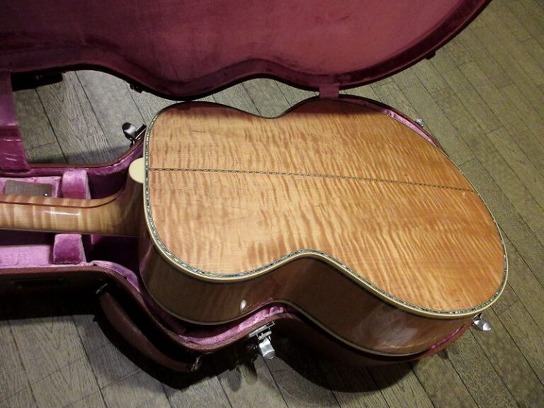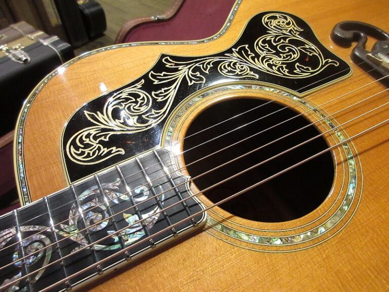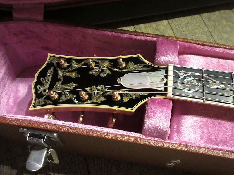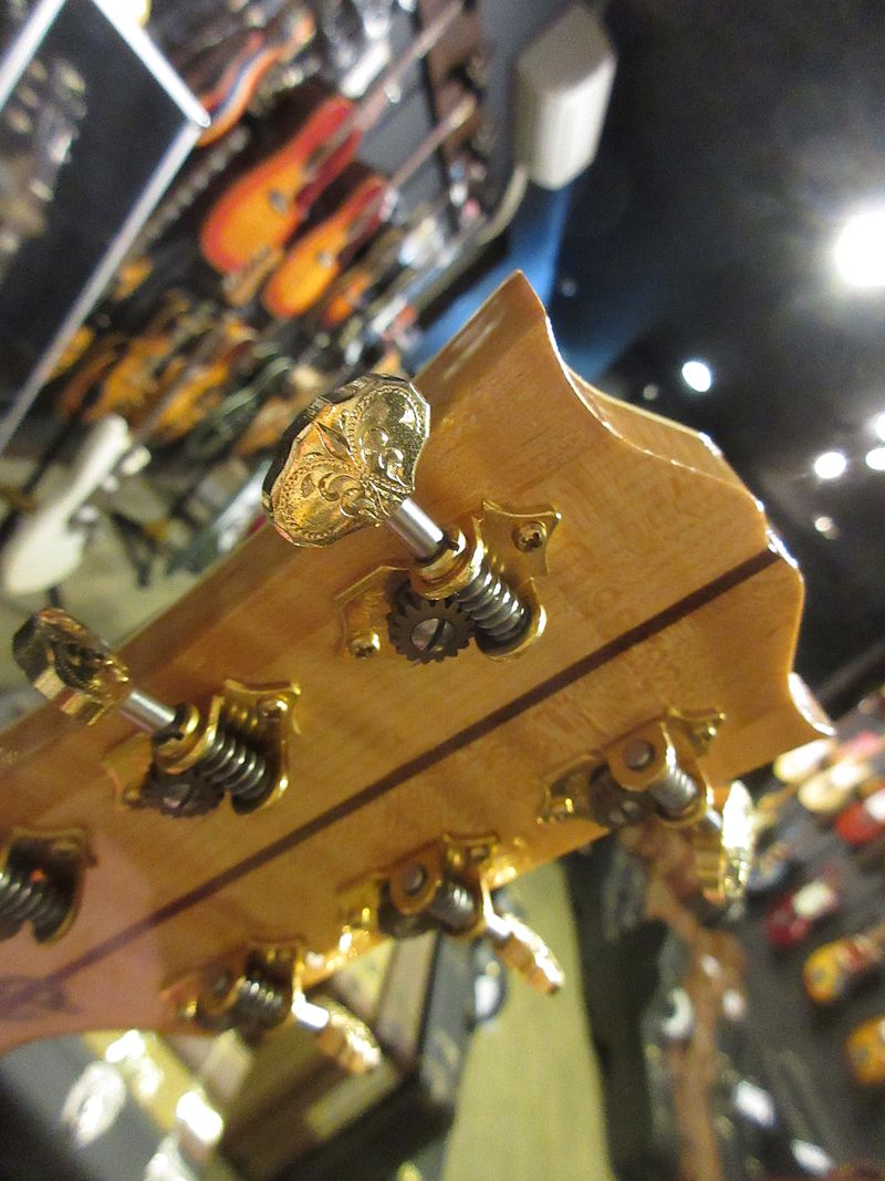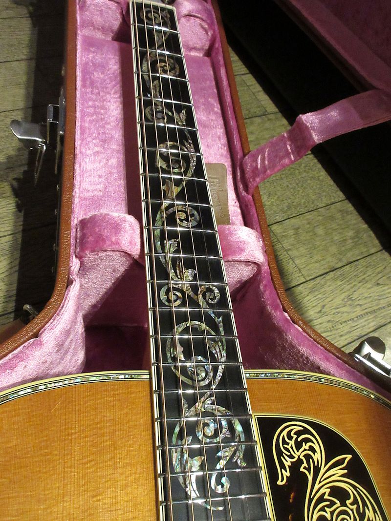 1938年、カントリーミュージシャンのRay WhitleyがGibsonにオーダーしたモデルをベースとして誕生したSuper Jumbo Model。その後SJ-200、J-200とモデルネームの変更が行われますが、17インチボディー、スプルーストップ、メイプルサイド&バックボディーから生みだされるパワフルなサウンドは「King of the Flat Top Guitar」と呼ばれ、いつの時代も憧れの的であり続けるGibsonの名機です。本機は2002年製のSJ-200 Custom Vine!「Vine=蔓(つる)」の名称通り、蔓をモチーフとしたアヴァロンインレイが指板からヘッドにかけて施され、ボディーやムスタッシュブリッジに至るまで豪奢なアバロンロゼッタや装飾が施された最高級モデル!チューナーはゴールドの彫金入りWaverlyがマウントされ、ピックガードには蔦のインレイが施されています。指板材には良質なエボニー材が用いられ、ボディーには最高級のフレイムメイプルを採用、まるで芸術品のような趣を湛える1本に仕上がっております!SJらしい量感のある低音域を感じさせながらもクリアーな高音域が澄み渡る絶品サウンド。経年によるナチュラルなウェザーチェックや小傷は散見されますが、それらを補って余りあるほど視角に訴えてくるド迫力の個体です♪元々の生産本数が少なく中古での流通本数は非常に限られる個体、オリジナルハードケースが付属致します。