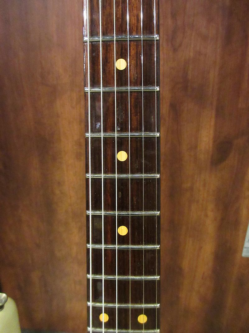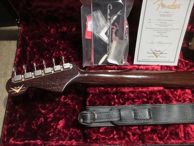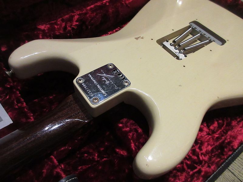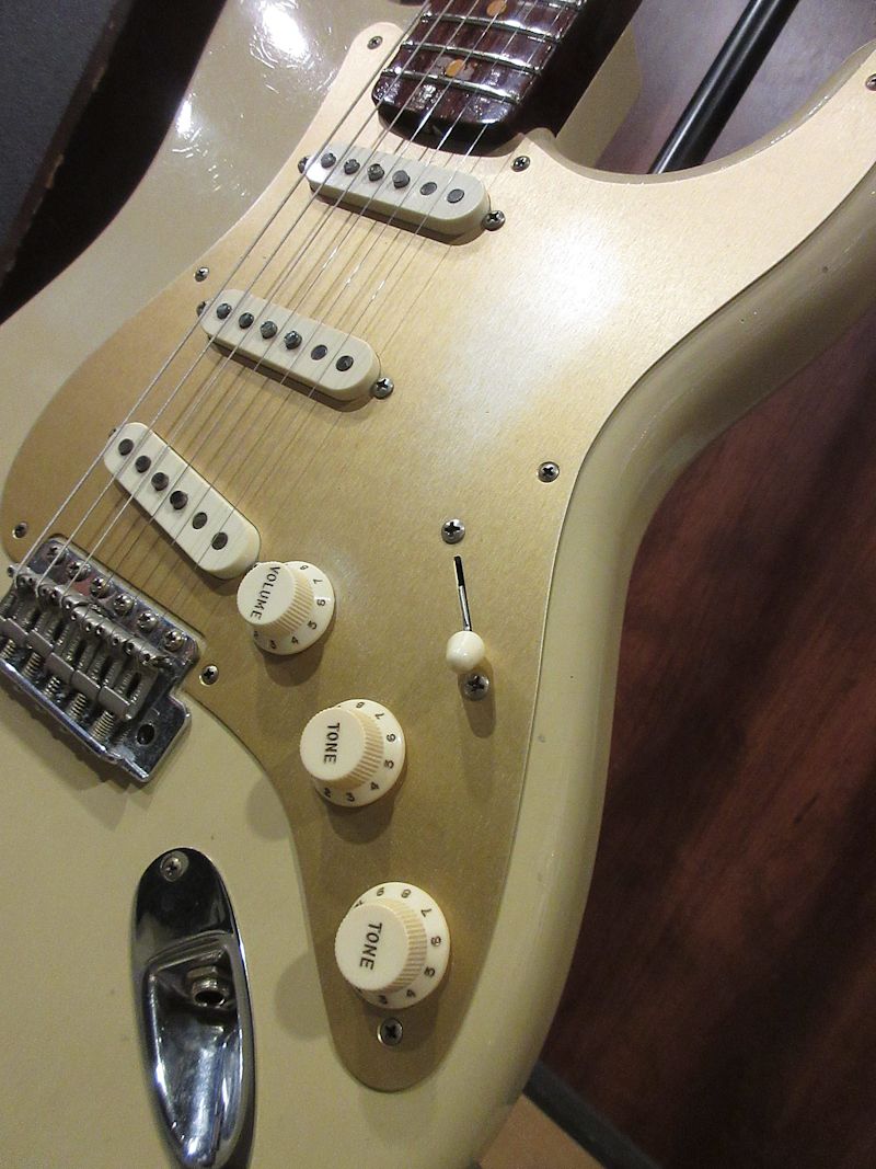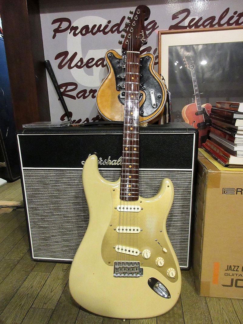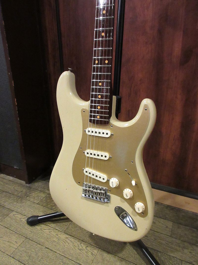 Norman’s RARE Guitars Bookに”First rosewood neck strato”として紹介されているExtremely RAREな1957年製のストラトキャスター、本機はその幻とも言えるローズウッドネック仕様のストラトキャスターをFender Custom Shopが限定生産した貴重なモデル!デザートサンドカラーのアルダーボディーにアノダイズドピックガードが組み合わされ、フロントとミドルにFAT50’s、リアにTexas Specialのハンドワウンドピックアップを搭載。ネックは57年スタイルのソフトVシェイプ、9.5Rラディアスの指板に6105フレット仕様の近年最もポピュラーとも言える仕様で仕上げられています。Journeyman Relicの程よい経年感とマッチする、澄んだクリーントーンにドライブさせてもしっかりと芯の残るトーンはこのマテリアル構成ならでは!ブラジリアンローズウッドは言うに及ばず、インディアンローズウッドも良質な材が枯渇しつつあるとも言われる昨今、今後同様のモデルの製作が難しくなるのは想像に難くありません。コンディション良好な希少な個体、是非チェックしてみて下さい。ウェイト3.53kg、認定書類、カスタムショップ製オリジナルトーレックスケース付属。