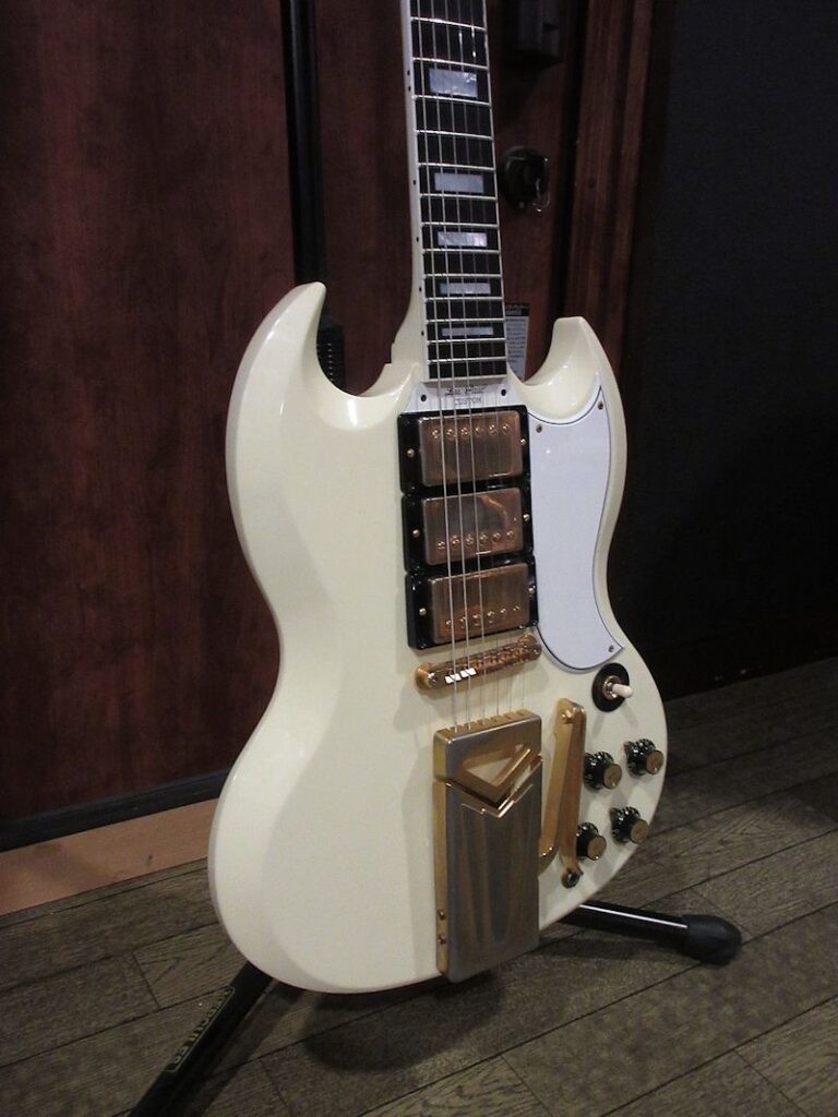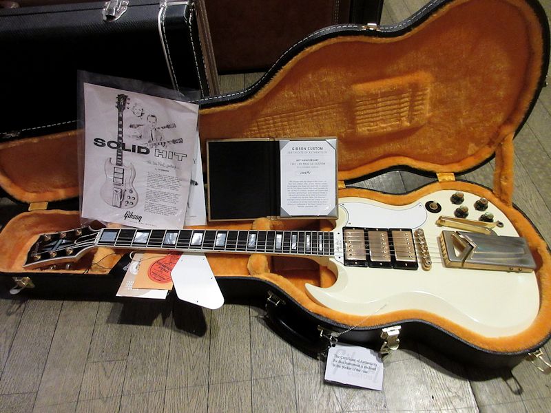 1961年に誕生以来のオリジナルシェイプからSGシェイプへとモデルチェンジを果たしたレスポールモデル。SGモデル誕生60周年を記念してGibson Custom Shopより限定発売されたリミテッドモデルが入荷しました。本機はホワイトのカスタムモデルをリイシューした1本で、ブラックカラーからホワイトカラーへ装いも新たに登場した3ピックアップのカスタムを見事に再現!オリジナル同様、ゴールドのグローバーペグやプルサイドウェイアームユニットを搭載し、マエストロアーム期のSGとはまた違った、この仕様ならではのトーンをたっぷり味わえる1本に仕上がっておりますセンターポジションはミドルピックアップとリアのインフェイズサウンド(オリジナルはアウトオブフェイズ)となっており、より実用的で「使える」仕様となっているのも見逃せません!僅かなプレイウェアは散見されますが、トータルコンディションは素晴らしく、芳醇で太さのあるクリーントーン、ドライブさせた際のファットでコシのあるサウンドは流石Gibson Custom Shopクオリティー!認定証類も完備した記念モデル、流通量も少ない個体ですので是非チェックしてみてください。カスタムショップ製ブラックハードケース付属。