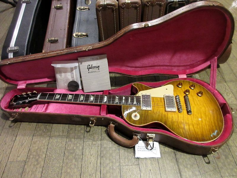 エイジングのエキスパートとして知られるTom Murphy氏が長年培ってきたフィニッシュやエイジングの知見を余すところなく反映し、オリジナルヴィンテージと錯覚するかのようなリアルなヴィンテージリイシューを生み出すマーフィーラボ。ラッカーによるチェッキングや、プレイした際に生じるウェアや使い込まれたパーツの雰囲気まで再現し、Gibson Custom ShopのVintage Reissue Seriesにおけるトップラインとして君臨しています。本機は2023年製の1959 Heavy Aged Model。長年ハードに使い込まれたルックスをイメージしており、パーツの傷み具合やバックルウェアの位置など、マニアも唸る完成度を誇ります。Green Lemon Fade Colorと大ぶりなワイドシーガルフレイムに、リアリティー溢れるウェザーチェッキング&エイジングの相乗効果は素晴らしく、ヴィンテージライクなオーラ溢れる1本に仕上がっています!エイジド以外の目立つ傷もなくコンディションも抜群。カラッと乾いたトーンが心地よいクリーンでもドライブでも満足度の高いサウンドクオリティー♪新品購入を検討中の方にも是非お勧めしたいナイスフレイムの1本です!ウェイト3.98kg、認定書類、カスタムショップ製エイジドブラウンケース付属。